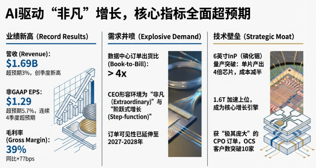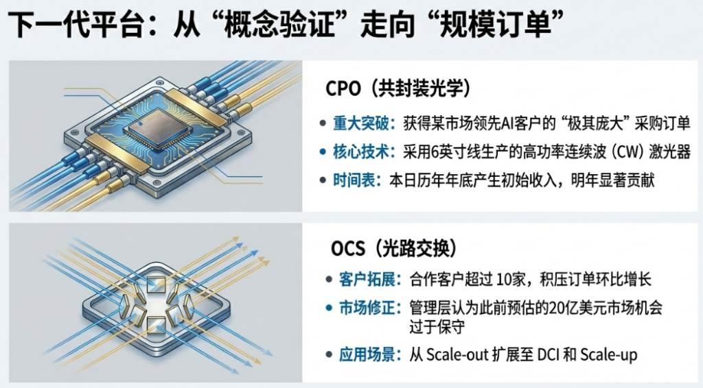 产品与客户侧,公司披露获得“极其庞大”的CPO(共封装光学)订单,同时OCS(光路交换)平台客户数已超10家、积压订单增长,剑指未来数年超过20亿美元的市场机会。