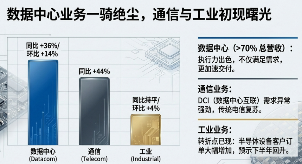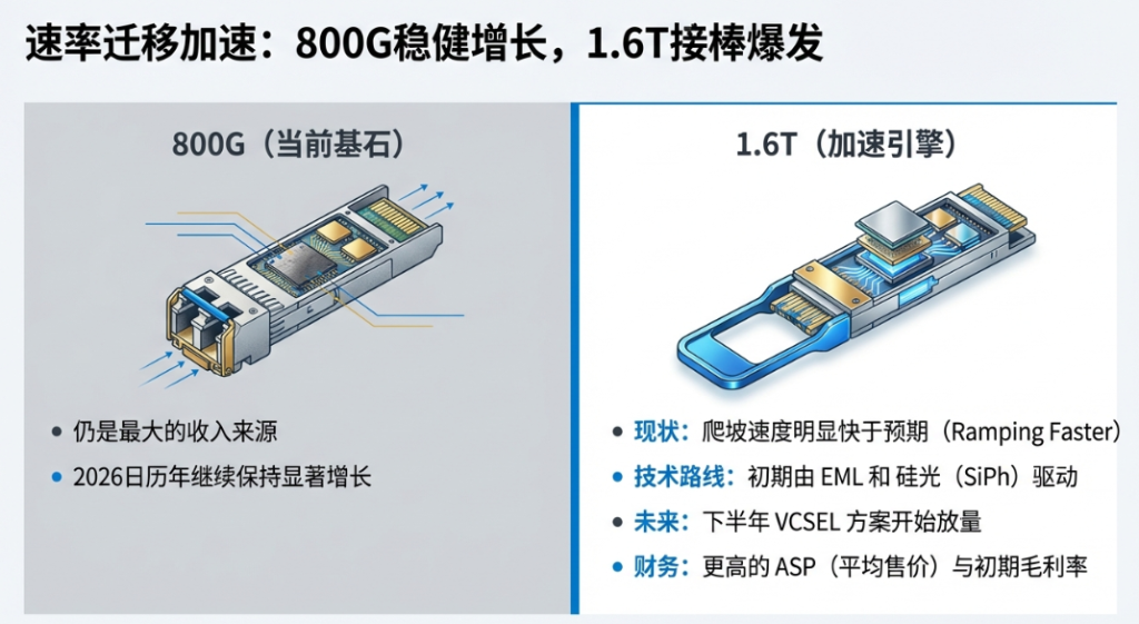 在产品结构上,AI数据中心的需求正在从800G向更高速率的1.6T快速切换。虽然800G仍是目前最大的收入来源,但1.6T的增长速度明显更快。