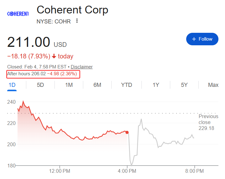 2月4日美股盘后,Coherent公布2026财年第二财季业绩,调整后每股收益1.29美元,高于市场一致预期的1.22美元。营收16.9亿美元,同样超过预期,并创下季度新高。与去年同期相比,公司盈利与收入均实现明显增长。