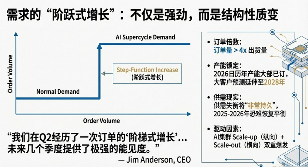 CEO Jim Anderson在电话会上用“非凡(extraordinary)”一词来形容当下的需求环境。他透露,公司在Q2经历了一次订单的“阶梯式增长”(step-function increase),特别是在数据中心领域,订单出货比超过了4倍。