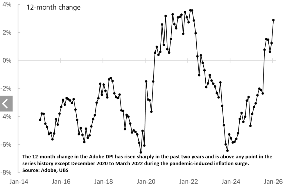 据瑞银(UBS)分析,Adobe数字价格指数(Adobe's Digital Price Index)显示,1月份美国在线零售价格的环比涨幅创下该指数12年历史新高。