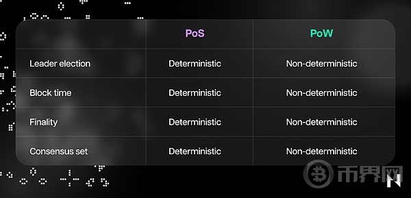 而在 PoW 链中,验证者选举是非确定性的。在区块被挖出之前,无人知晓下一个区块由谁生成,这促进了点对点网络中节点的平等性。共识集合也是非确定性的,矿工可自由加入或退出网络,任何节点均可生成区块,没有矿工对链的延续不可或缺。这在 PoS 中是不可能的,因为 PoS 的共识集合是确定性的,某些验证者必须在场才能推进链的发展。