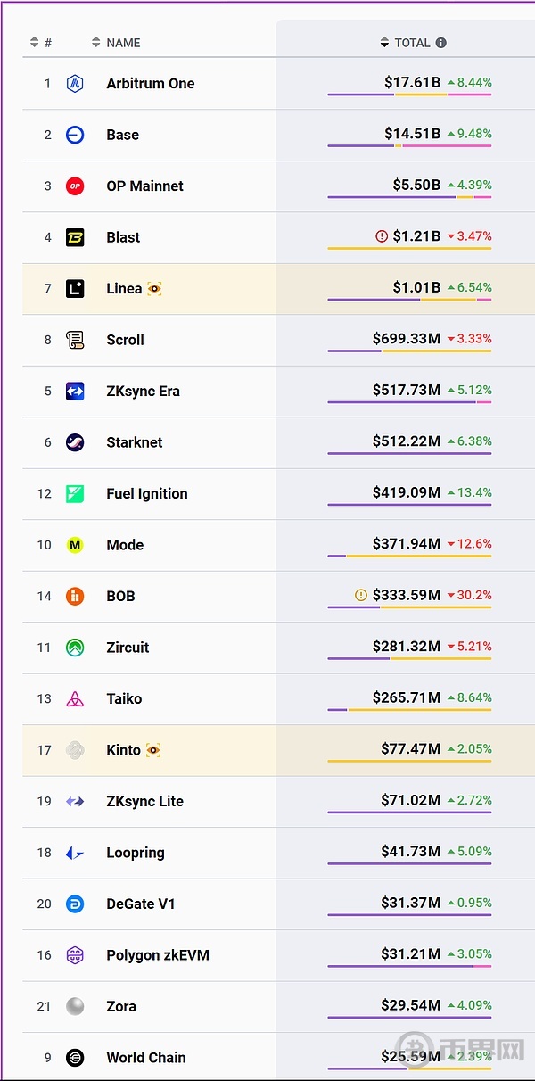 排名前两位的 Layer 2 项目 Arbitrum 和 Base 的总 TVL(321.2 亿美元)超过了其余 18 家 Layer 2 项目 TVL 的总和(114.3 亿美元)。(来源: L2Beat.com)