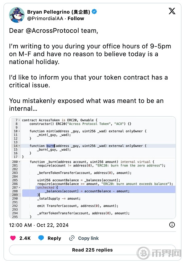 现实案例最能说明这一问题的严重性。LayerZero[39] 联合创始人兼 CEO Brian Pellegrino 近期在推文[40]中指出,跨链互操作协议 Across[41] 的代币合约存在严重漏洞:代币合约中的某个函数允许合约所有者随时转移任意钱包中的代币。简而言之,Across 团队可以从任何持有这些代币的用户那里窃取代币。