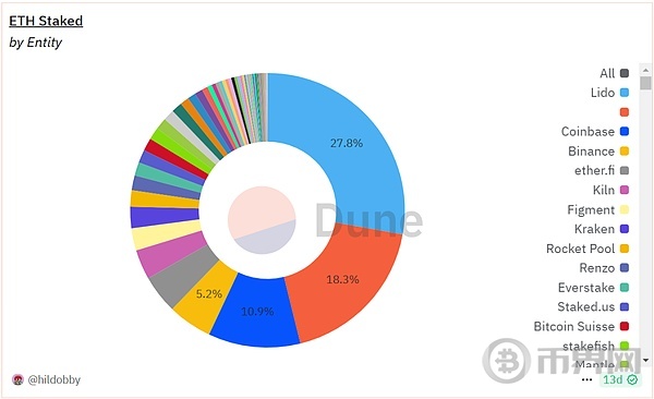 各实体质押的 ETH 占总质押的百分比 (来源: dune.com)