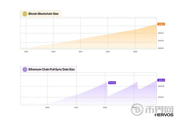 数据对比可直观体现差异:运行以太坊全节点的最低要求为 2TB 固态硬盘、16GB 内存、第七代或更高版本的英特尔处理器;而运行比特币全节点仅需低端 CPU、2GB 内存和至少 15GB 的可用磁盘空间。此外,以太坊正面临状态爆炸问题[46] —— 其状态的增长速度是比特币的 3.5 倍,且无法修剪旧状态数据,这意味着状态增长没有上限。