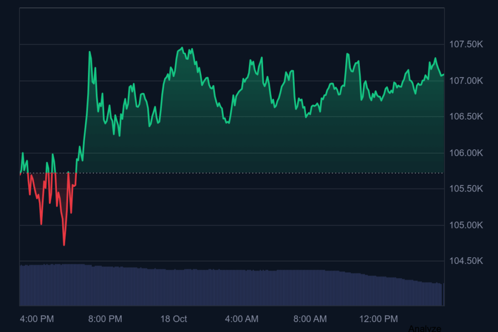 比特币(BTC)和以太坊(ETH)是市值最大的两种加密货币,也是今日市场复苏的主要驱动力。BTC 在过去 24 小时内上涨 1.09%,达到 107,056 美元,ETH 上涨 2.57%,目前交易价为 3,879 美元。分析师指出,随着投资者在近期市场下跌后重拾信心,此次反弹可能预示着更广泛复苏的开始。