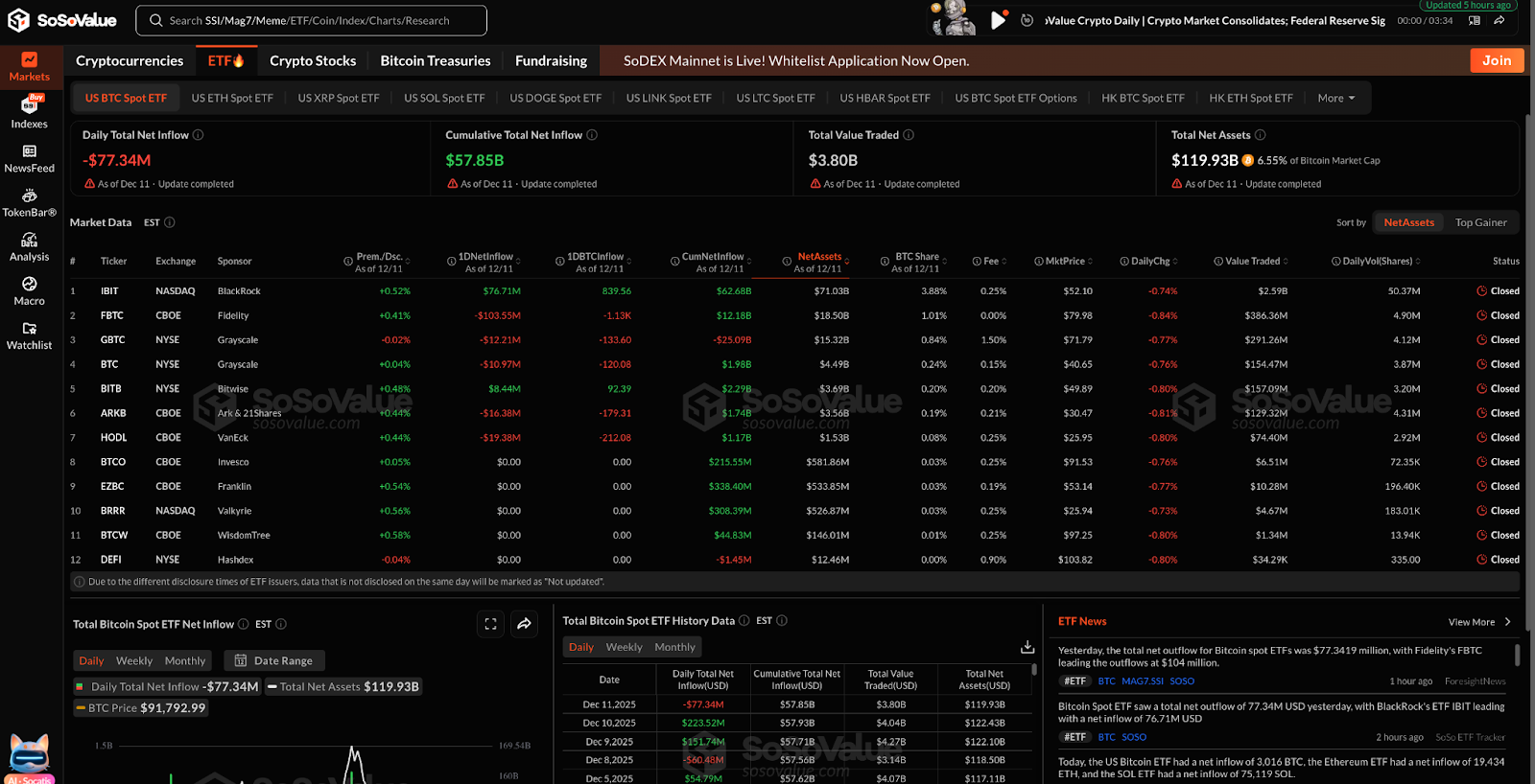 SoSoValue 的数据显示,12 月 11 日美国比特币现货 ETF 净流出资金达 7734 万美元。仅富达的 FBTC 就录得 1.0355 亿美元的赎回额,而灰度旗下的 GBTC 和 BTC ETF 产品分别出现 1221 万美元和 1097 万美元的赎回。