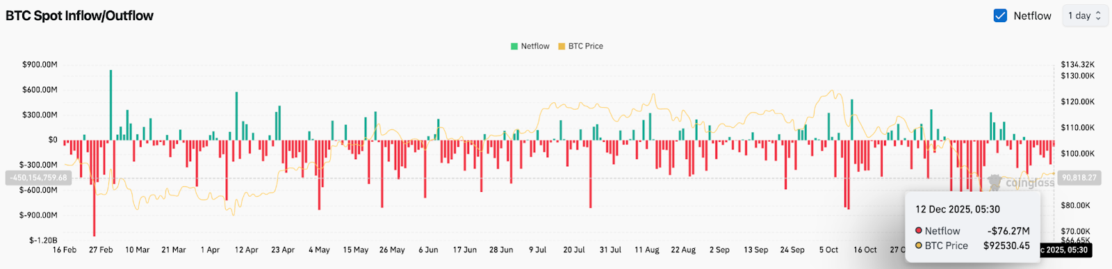 这与现货数据相符。Coinglass数据显示,12月12日净流出资金达7627万美元,再次表明流动性从钱包流向交易所。周线流量数据中持续出现的红色柱状图凸显了谨慎情绪,年初的资金流入高峰并未重现。