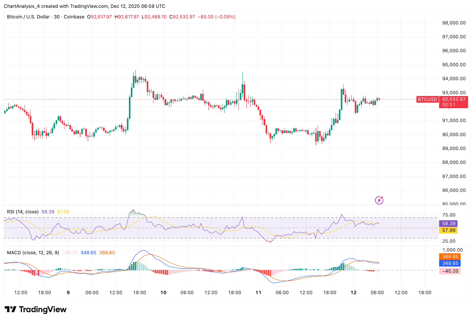 30分钟图表显示,比特币在周三回调后尝试小幅反弹。比特币价格重回92,500美元,但成交量疲软,价格横盘整理。相对强弱指数(RSI)接近58,动能较弱;移动平均收敛/发散指标(MACD)虽然仍位于信号线上方,但走势趋于平缓。