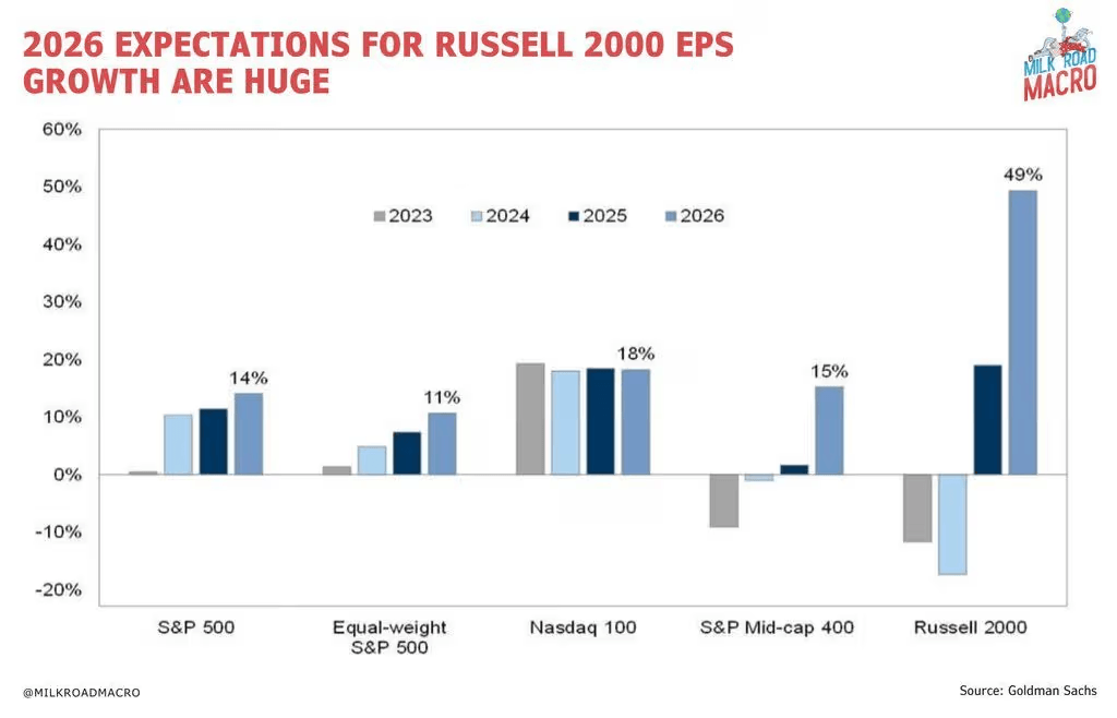 Milk Road Macro 在 X 上指出,规模较小、风险较高的公司对利率变化的敏感度高于大型股票。在美联储周三降息 25 个基点之后,这种敏感性尤为重要。高盛表示,市场对 2026 年罗素 2000 指数每股收益增长的预期异常强劲,约为 49%。