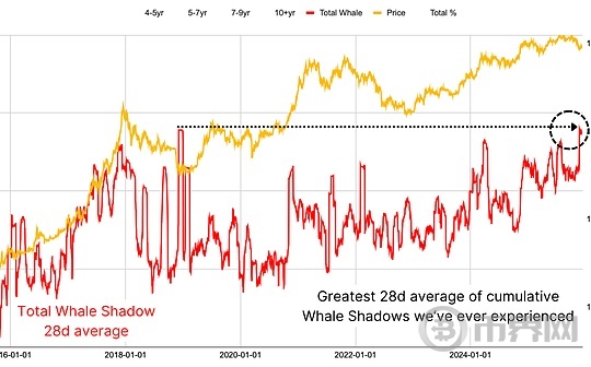 尽管比特币在2025年以美元计价创下历史新高,但如果以黄金(更能准确反映其真实购买力)衡量,比特币实际上在大约一年前的2024年12月就已达到峰值,此后下跌超过50%。这种差异解释了尽管名义价格屡创新高,但许多投资者仍感到心理上的痛苦。这一年,巨鲸交易异常活跃,长期持有者累计数量指标“巨鲸阴影”(Whale Shadows)达到历史最高水平,表明大量长期持有者比特币被前所未有地转移到市场。