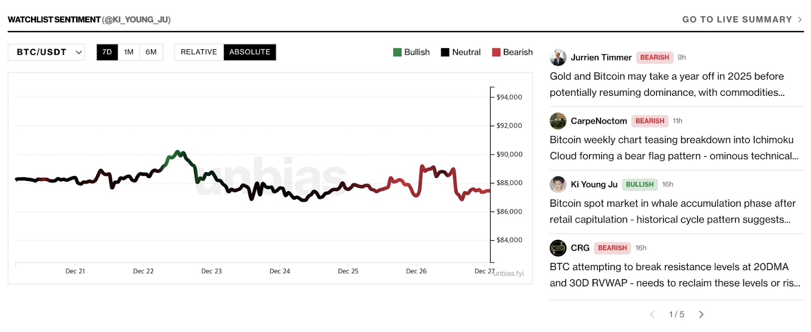 今天,在几位备受关注的分析师被人工智能驱动的情绪追踪器标记为看跌后,比特币市场情绪转为悲观。