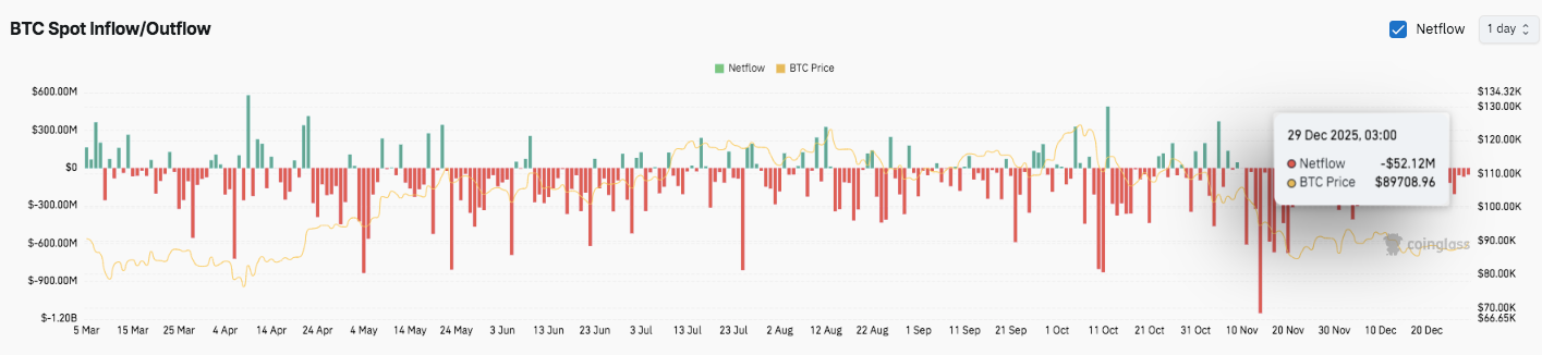 尽管出现了短暂的资金流入,但这更像是逢低买入而非持续积累。12月下旬,净资金流入仍为负值,其中包括接近89,700美元的显著资金流出。