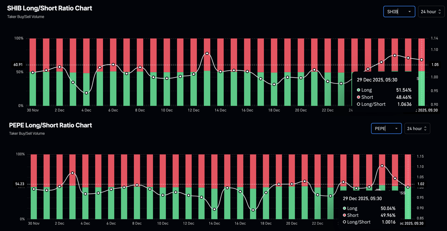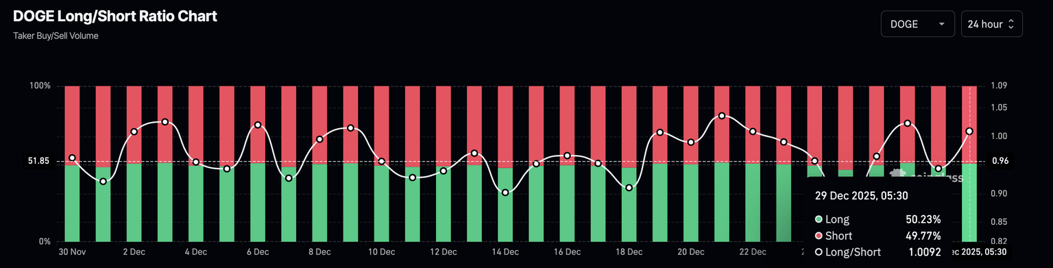 CoinGlass数据显示,市场对狗狗币、柴犬和Pepe的情绪普遍乐观。多空比率图表显示,狗狗币的多头头寸占所有活跃头寸的50.23%,高于前一日的47.16%。多头头寸的积累表明交易者预期价格将进一步上涨。