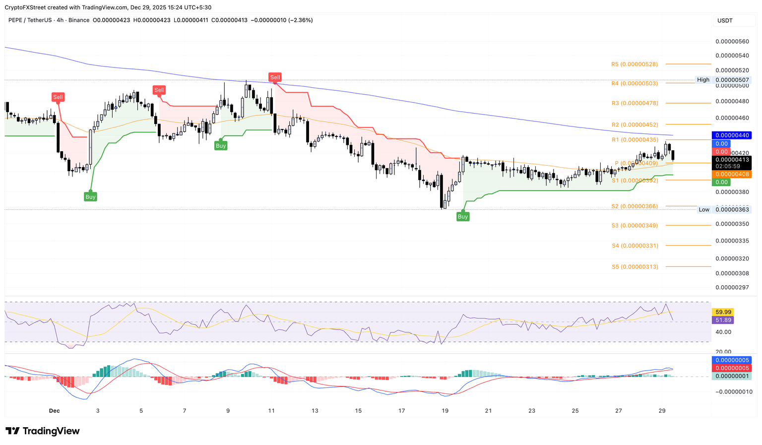 截至周一发稿时,Pepe 价格徘徊在 0.00000400 美元上方,根据 4 小时图上的 Supertrend 指标显示,其整体趋势仍在回升。这枚以青蛙为主题的表情包代币延续了此前在 0.00000435 美元附近的 R1 枢轴点的反弹势头,并面临重新测试 0.00000409 美元中心枢轴点的风险。