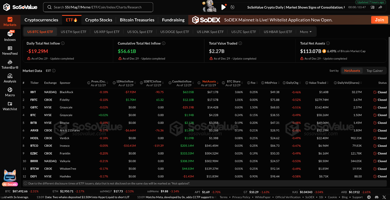 12月29日,美国现货比特币ETF录得1930万美元的净流出,延续了机构投资者谨慎的持仓策略。当日总成交额为22.7亿美元,反映出市场活动稳定,但买盘信心有限。