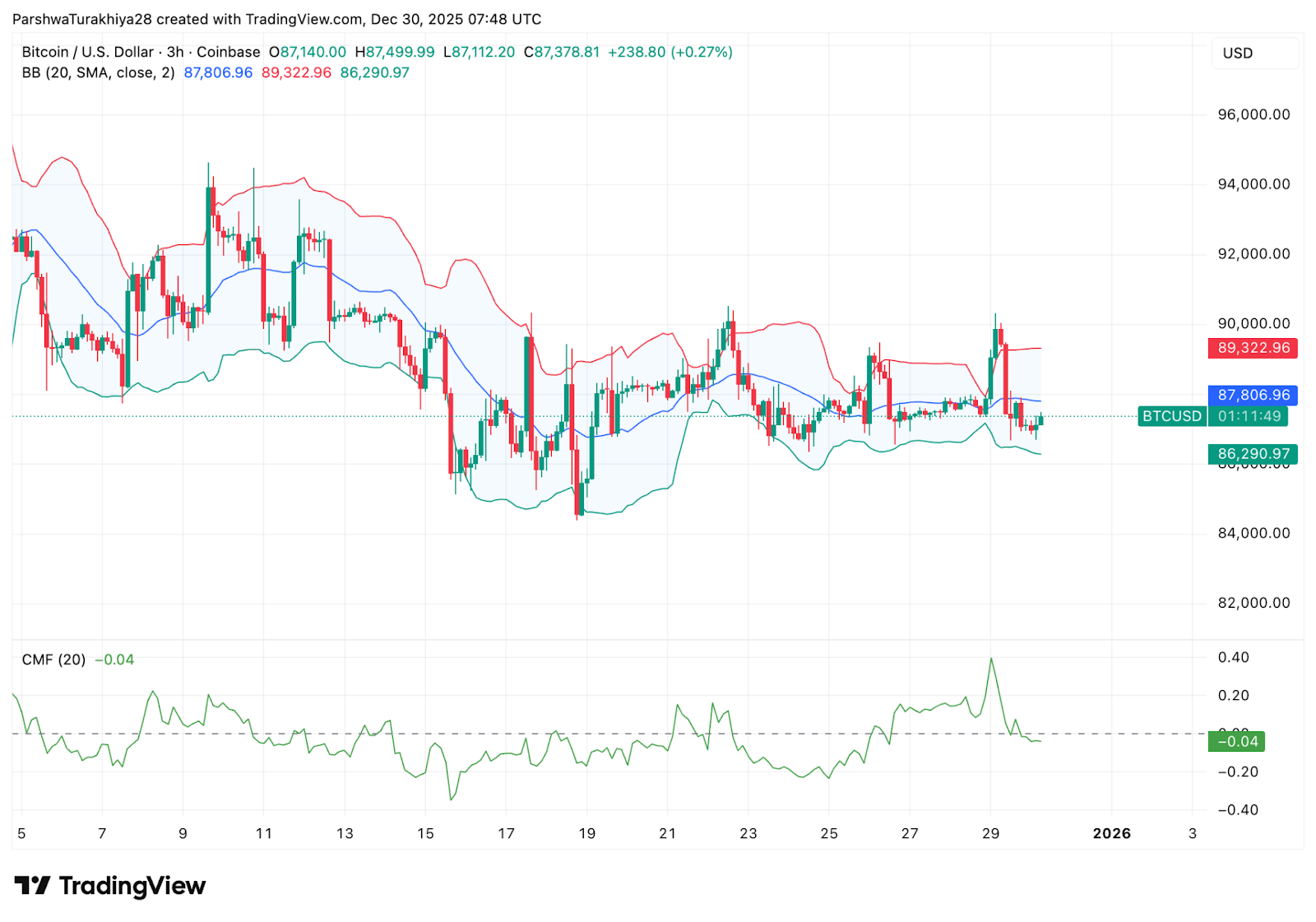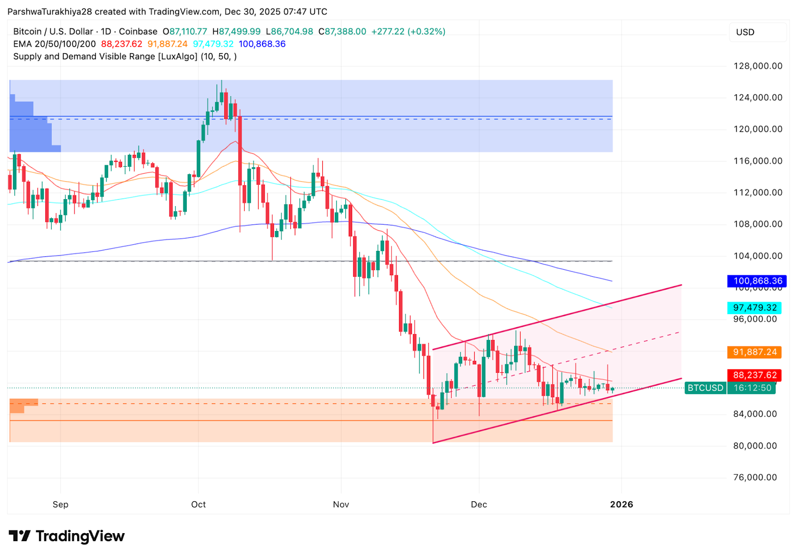 比特币今日价格接近 87,400 美元,守住短期支撑位,买家试图在正在形成的上升底部内稳定价格。市场仍受制于避险的现货资金流动和强劲的结构性需求,价格在 2025 年最后一个交易日到来之际保持承压状态。