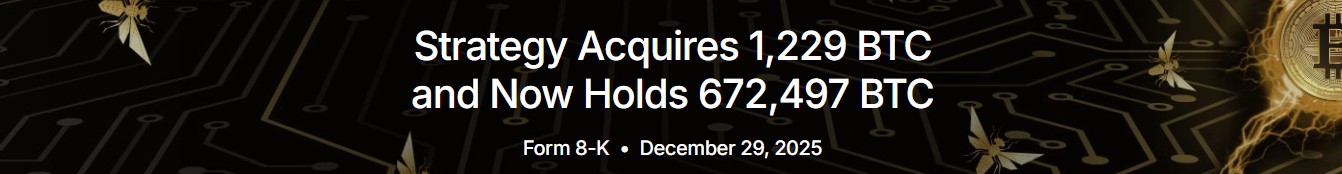 2025年12月22日至28日期间,该公司收购以每枚 88,568 美元的平均价格,以 1.088 亿美元的价格购入 1,229 枚比特币,使其总持有量达到 672,497 枚比特币,按年底价格计算价值约 590 亿美元。