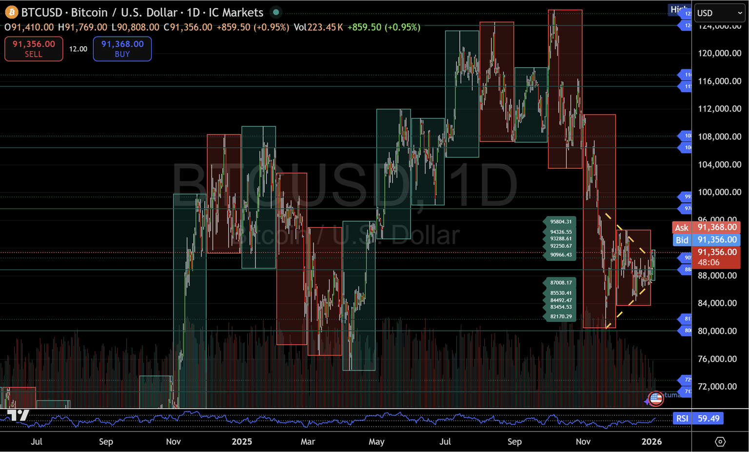 截至撰写本文时(2026年1月5日),BTC/USD交易接近91,200维持在该区域上方的接受度。也就是说,价格仍然足够接近关键参考值,该结构仍在测试中尚未证实。