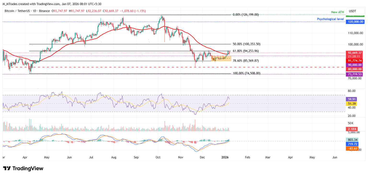 比特币在 94,253 美元阻力位附近遭遇抛售。