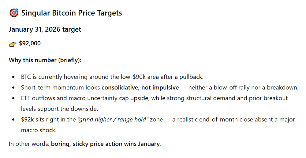 尽管存在许多潜在的催化剂,但人工智能模型对1月31日比特币的价格目标给出了非常保守且略微看涨的预测。具体而言,ChatGPT 估计,这种加密货币可能会上涨,并在月底达到92,000美元的交易价格。