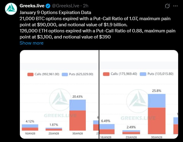 交易者应注意,市场洞察基于 1 月 9 日期间观察到的链上期权数据、技术指标和衍生品市场行为。