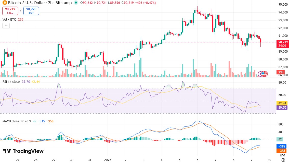 根据 TradingView 价格图表技术分析,目前该股交易价格为 90,005 美元,24 小时交易量下降近 9% 至 393 亿美元。