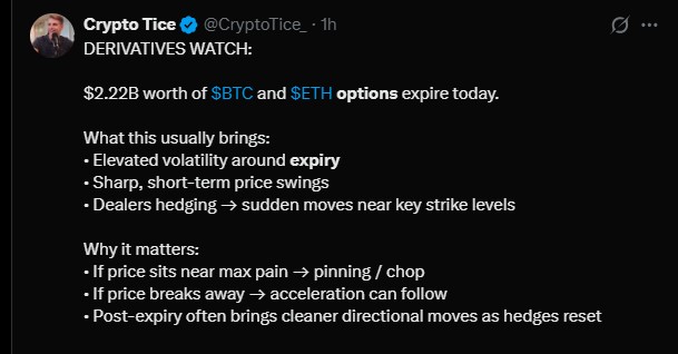 一个一位名叫 Crypto Tice 的加密货币专家在其官方 X 账户上指出,今天到期的价值 22.2 亿美元的 BTC 和 ETH 期权可能会造成市场波动。