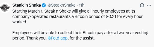 Steak n Shake 出人意料地推出了一项使用比特币的全新奖励计划。从 3 月 1 日起,该公司将向小时工发放价值 0.21 美元的 Steak n Shake 比特币奖励,每工作一小时即可获得 0.21 美元。该奖励将以比特币形式支付,并在两年的归属期后生效。