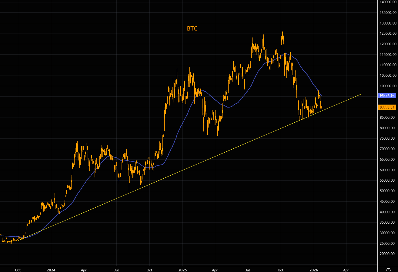 市场已开始反映这一担忧。比特币今年以来相对黄金下跌6.5%,而黄金同期上涨55%。比特币兑黄金比率在2026年1月降至19.26,显示投资者正在重新评估比特币的"数字黄金"地位。近期比特币在100日均线附近遭遇强劲回落,8.5万美元是需要密切关注的关键价位。