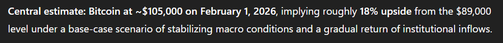 当被要求提供一个更中心的、具体的价位估计时,ChatGPT 表示,比特币在接下来的一周内将上涨约 18%,到 2 月 1 日价格将达到 105,000 美元。