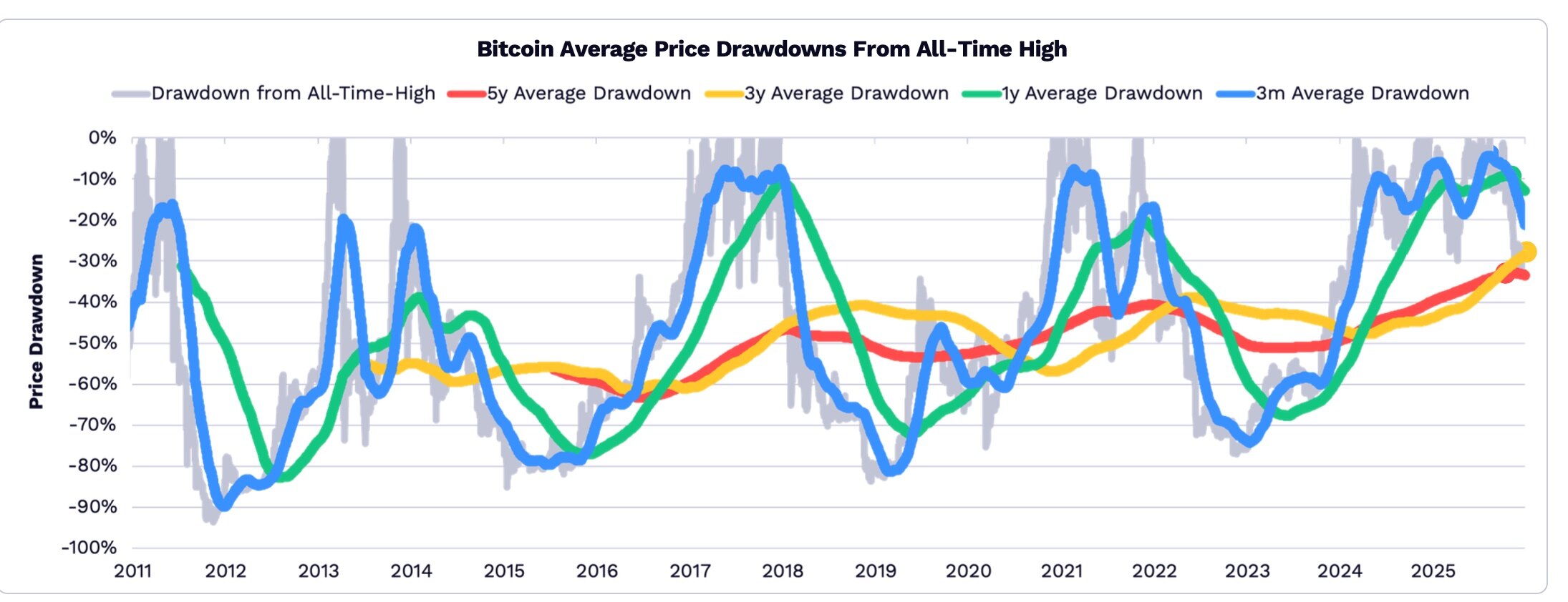 2025 年,比特币价格相对于其历史最高点的跌幅有所收窄,随着比特币作为避险资产的作用日益增强,其波动性有所降低。从 5 年、3 年、1 年和 3 个月的时间跨度来看,2025 年比特币的回撤相对于历史回撤幅度而言并不大。