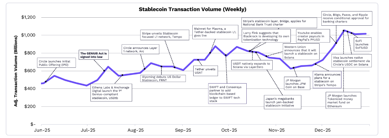 2025 年 12 月,调整后的稳定币交易量的 30 天移动平均值为 3.5 万亿美元,是 Visa、PayPal 和汇款总额的 2.3 倍。