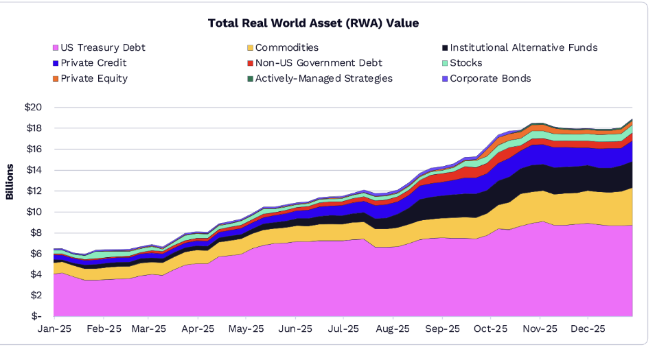在美国国债和大宗商品的引领下,2025 年代币化资产市场规模增长两倍,达到 190 亿美元