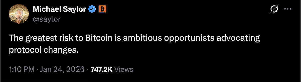 Saylor的帖子加剧了社区内部的分歧:一部分比特币支持者希望协议保持“固化”和稳定,而另一部分软件开发者则主张扩展比特币功能,例如支持抗量子钱包地址和链上文件存储。