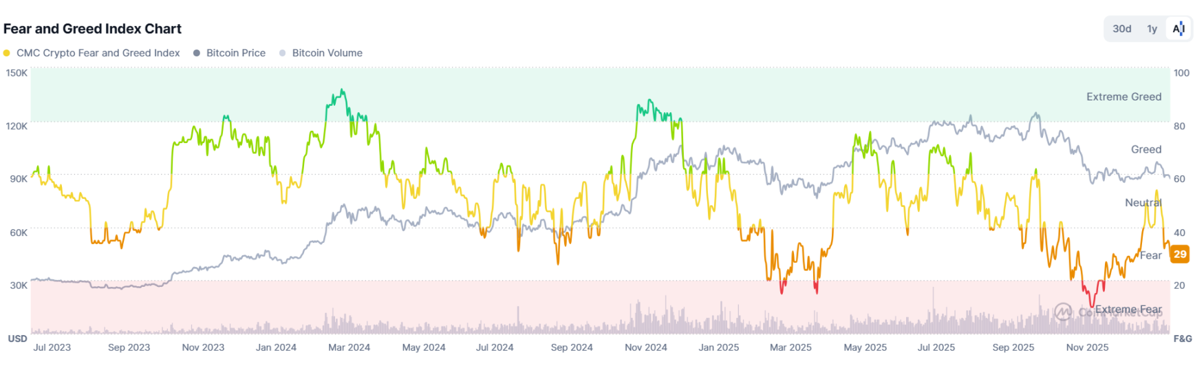 据 Coinglass 数据,过去 12 小时内,加密市场总爆仓金额高达 6.03 亿美元,其中多单爆仓 5.53 亿美元。恐慌指数目前报 29,处于“极端恐惧”区间。
