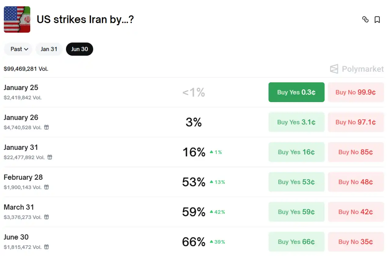 Polymarket 数据显示,市场押注美国将会在 2 月 28 日前对伊朗动武的概率已升至 53%。目前该预测市场成交额将近 1 亿美元。