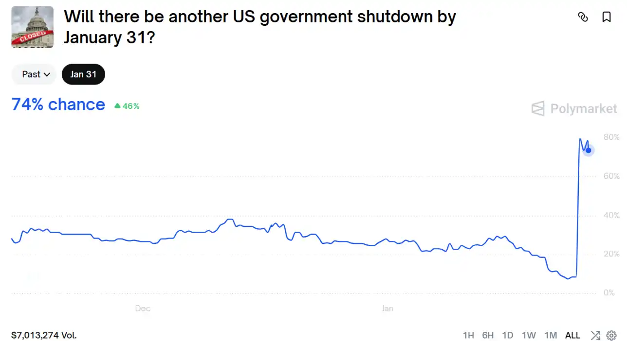 此外,美国政府关门概率陡然提升。1 月 26 日,Polymarket 上市场押注美国政府再一次关门概率从 8% 突然拉升至 80%,再次为风险资产蒙上了阴影。