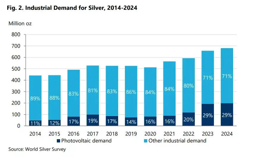 白银的工业需求量(深蓝色代表光伏需求,浅蓝色代表其他工业需求)| 来源:世界白银协会调查