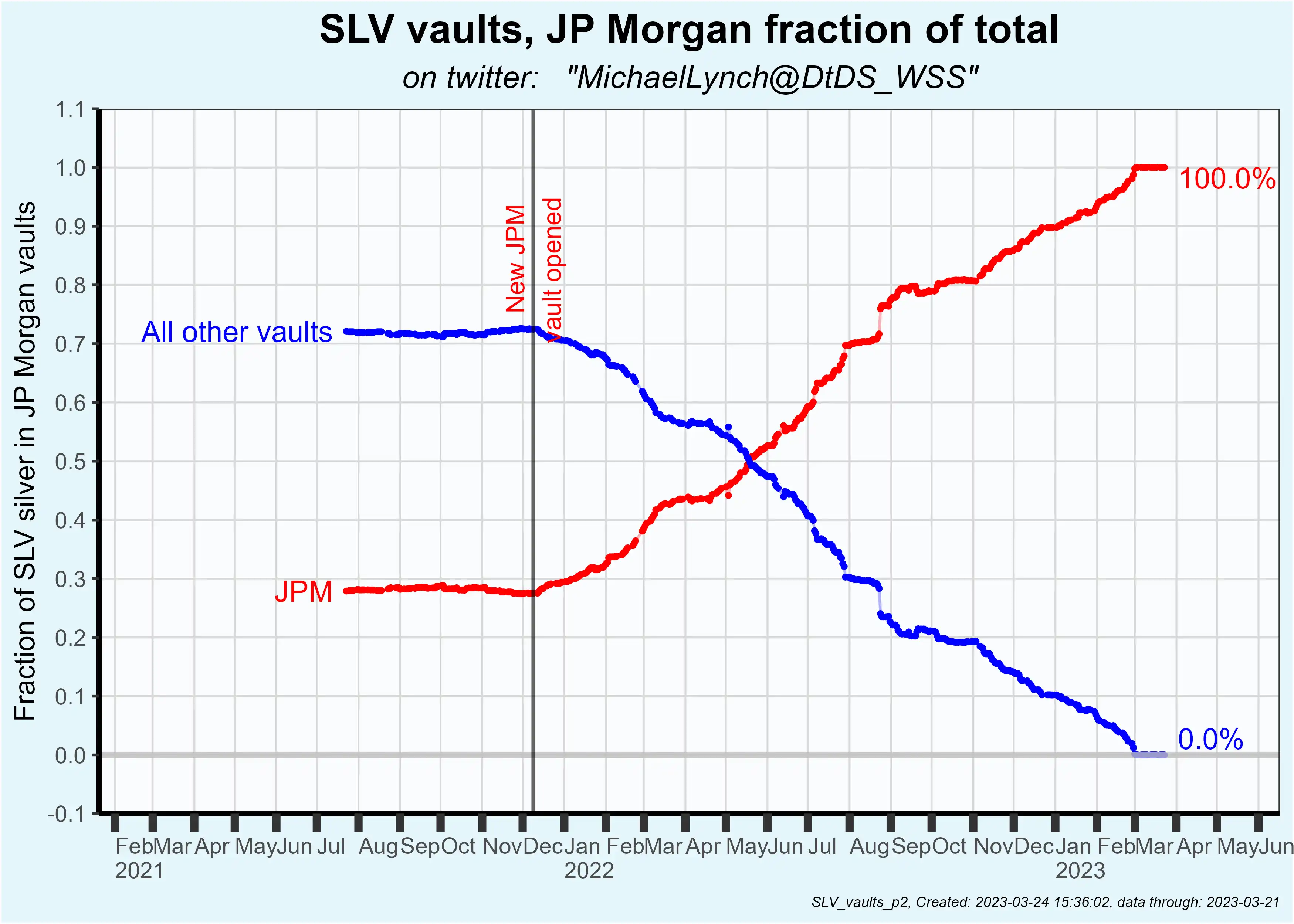 摩根大通在 2021 年 11 月开设新库房后,逐步接管了 SLV 的所有白银库存