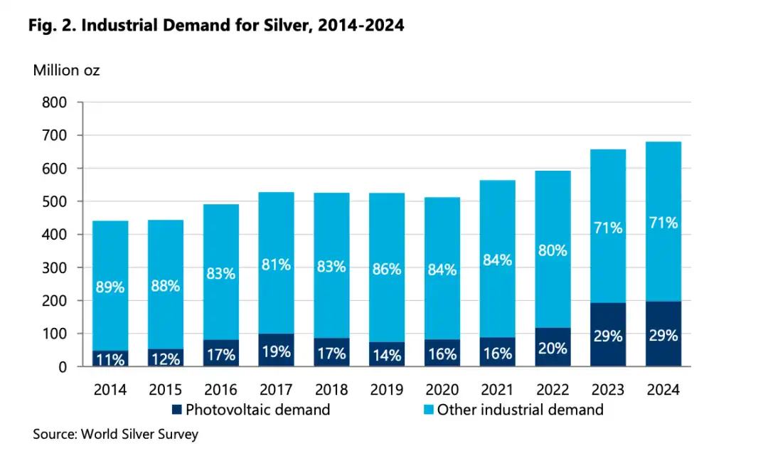 先看一组数据。据 World Silver Survey 2025 调查报告,2024 年白银工业需求达到 6.805 亿盎司,历史新高。这个数字占全球总需求的 60% 以上。