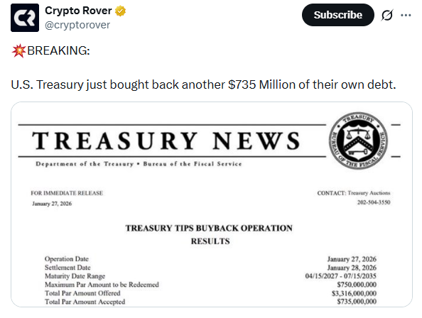 金融界悄然迎来了一股强劲的推动力。2026年1月27日,美国财政部确认回购了约7.35亿美元的本金。此举是美国财政部持续回购债券战略的一部分,此次重点回购的是期限最远达2035年的通胀保值债券(TIPS)。