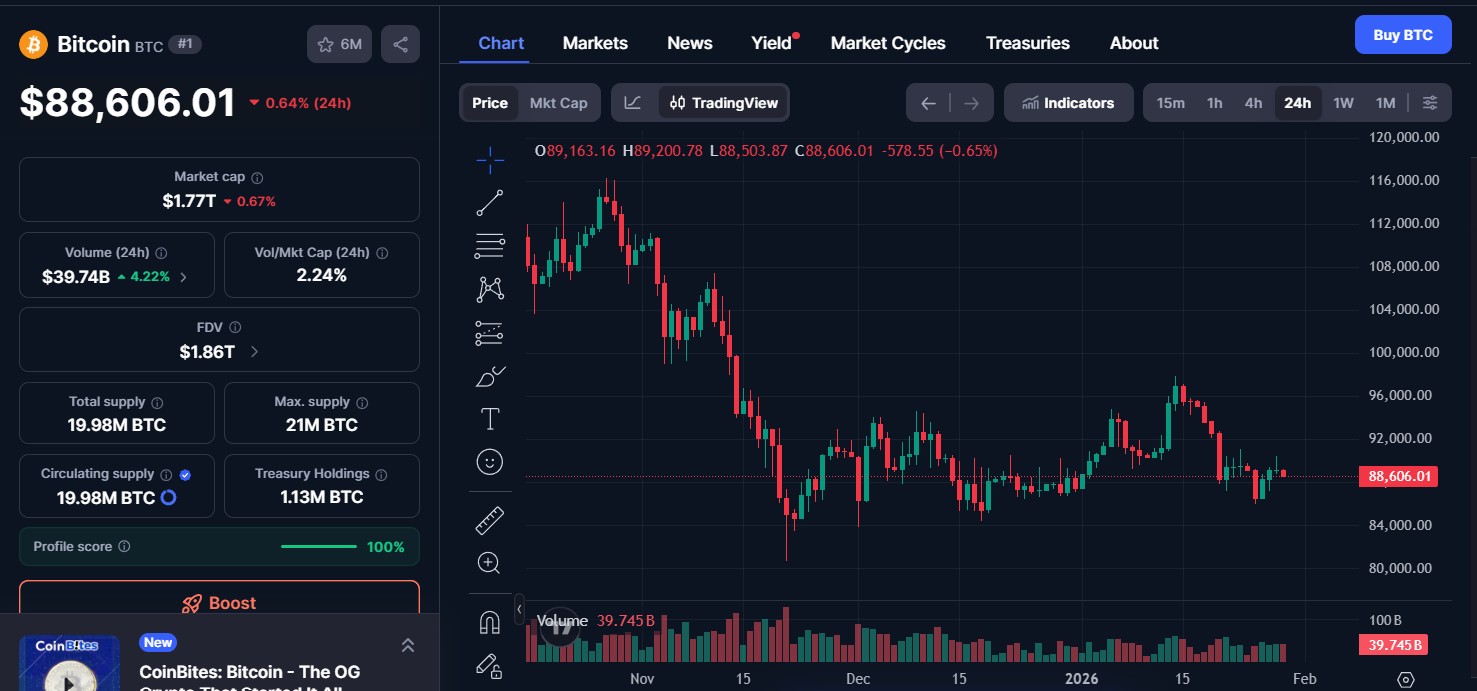 今日比特币 (BTC) 价格股价达到 88606 美元,在过去 24 小时内下跌 0.64%,交易量为 397 亿美元,市值为 1.77 万亿美元。