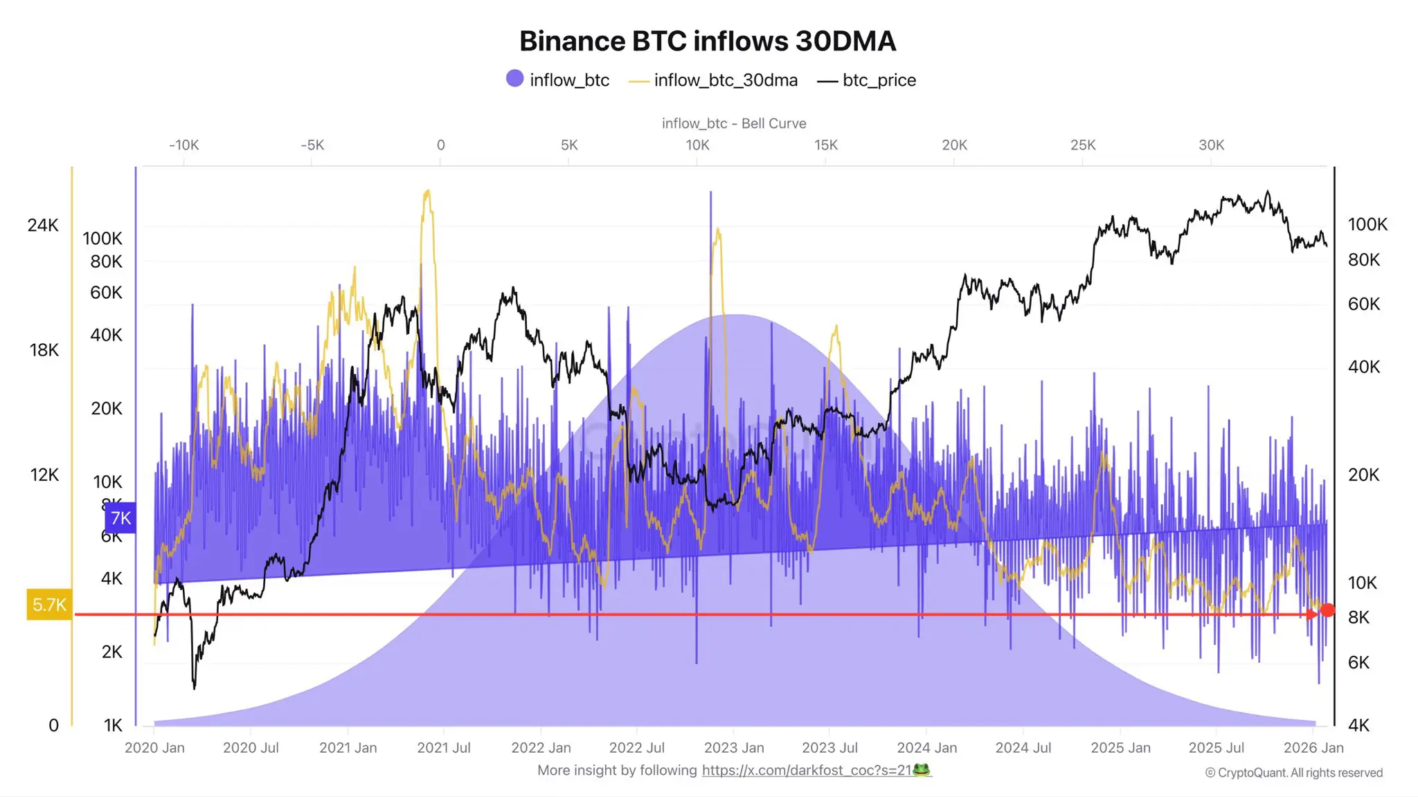 最引人注目的是这一趋势的持续性。连续数月,流入币安的比特币数量远低于历史平均水平,这表明这种放缓趋势正逐渐演变为结构性而非暂时性的。