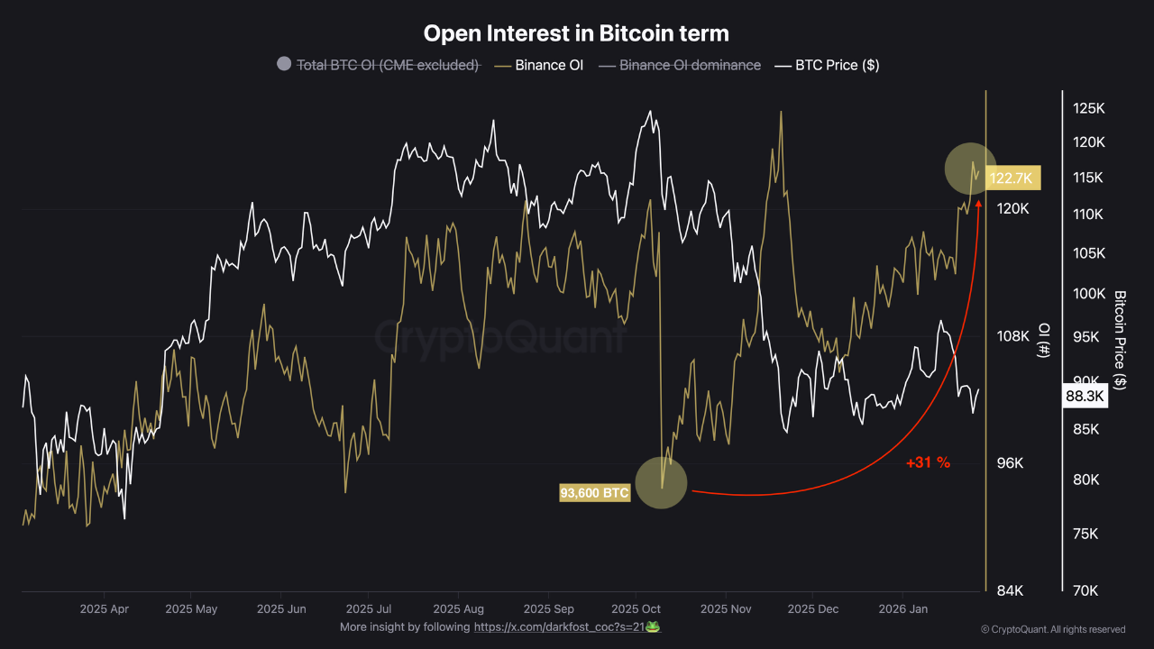 以比特币 (BTC) 衡量以消除价格波动的影响,币安的未平仓合约量已从 10 月 10 日之前的 93,600 BTC 增至约 123,500 BTC。这标志着大约 31% 的增长,表明杠杆交易正在反弹。