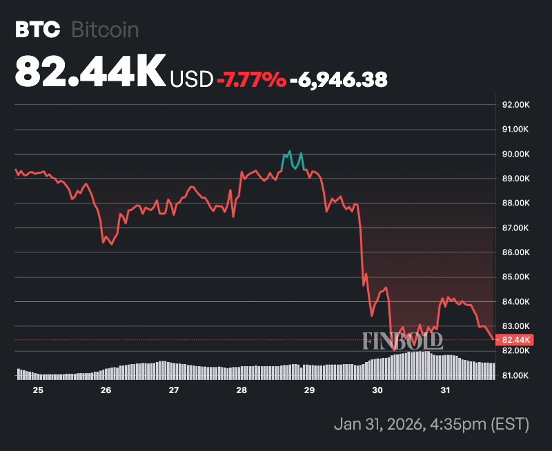 截至发稿时,比特币交易价格为 82,444 美元,在过去 24 小时内小幅下跌了 0.2%,而从周线图来看,这种领先的加密货币下跌了近 8%。