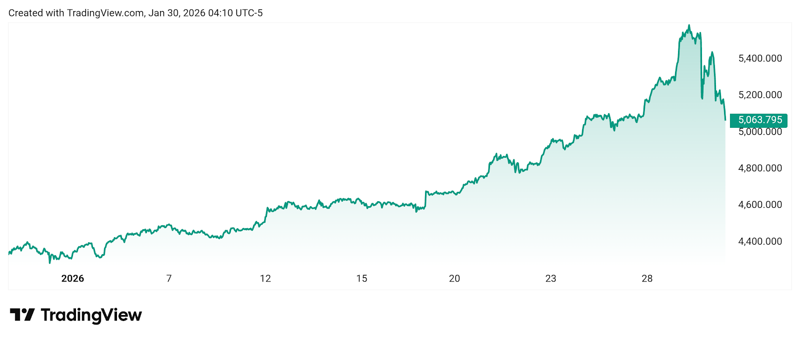 尽管每日有所下跌,但黄金价格本月仍上涨24.68%,较1月初上涨1065.07美元。央行购金和避险需求支撑了金价,尤其是在持续存在的地缘政治风险和通胀担忧的背景下。