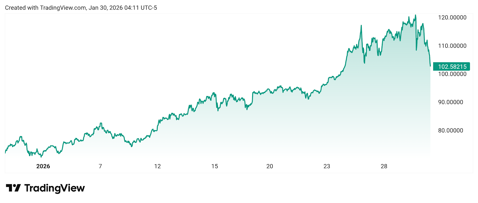 白银价格报每盎司107.83美元,较前一日下跌6.67美元,跌幅5.83%。此前,白银价格在本月初曾出现大幅上涨,过去30天内累计上涨51.95%,即每盎司39.61美元。