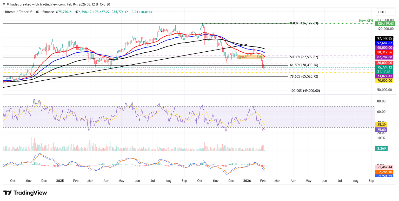 比特币价格周日收盘价为 78,490 美元,低于 61.8% 的斐波那契回撤位(从 2024 年 8 月的低点 49,000 美元到 2025 年 10 月的历史高点 126,199 美元)。随后价格回调近 4%,周二触及 72,945 美元的低点(这是自 2024 年 11 月初以来的最低水平)。截至周三发稿时,比特币交易价格为 75,700 美元。